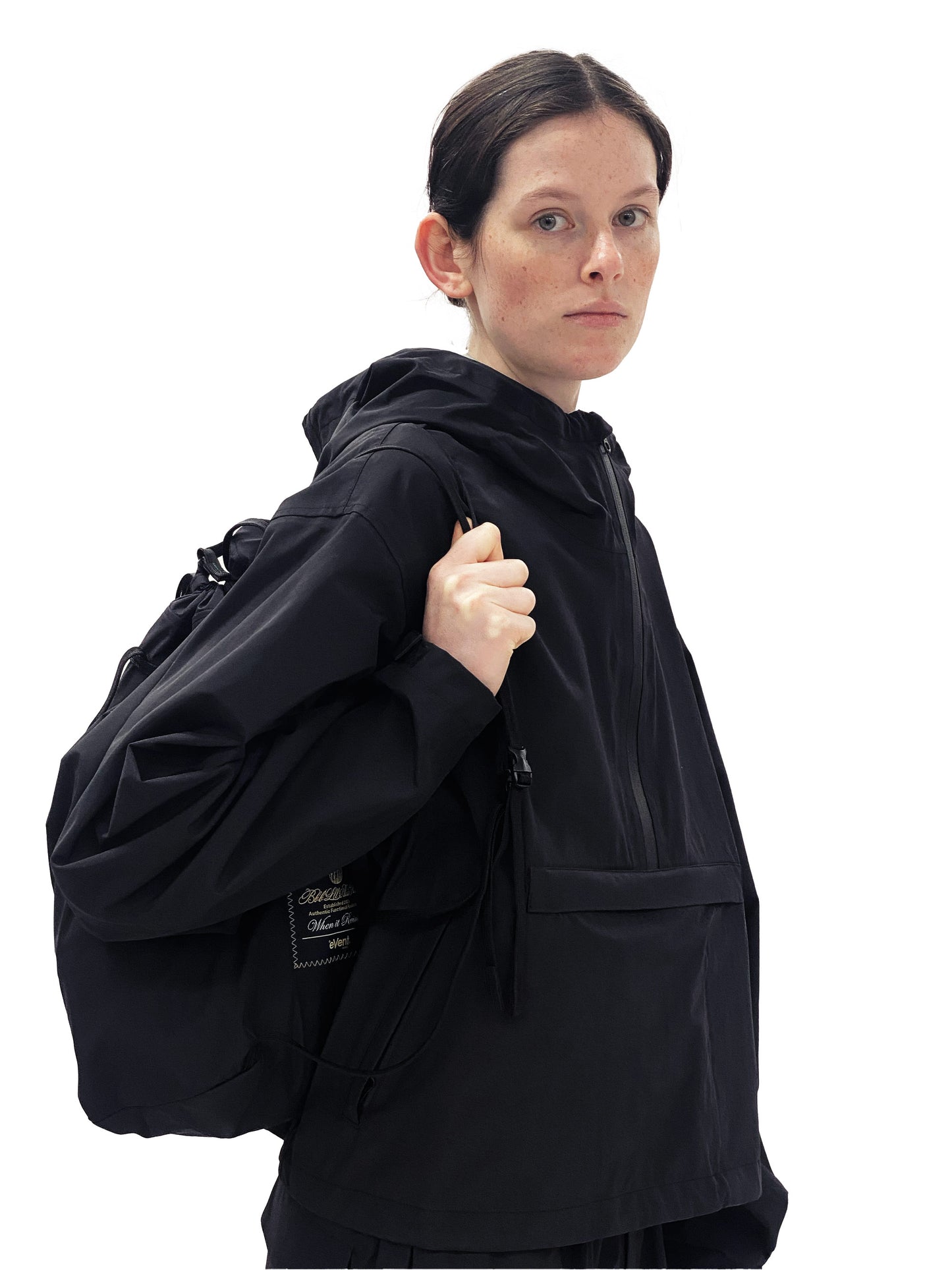 The bag that she is carrying is the eVent bag. Using the same waterproof material as the anorak, it is perfect to be your rainy day bag. Plus, like the other Bbb pouches, it can be opened in one swift single-hand motion (after some practice). Meaning, you can take things out with an umbrella in your other hand. Now you’re freed from that difficulty of balancing an umbrella on your shoulder so that you can use both hands to rummage through your bag to find what you need right when it’s pouring out.