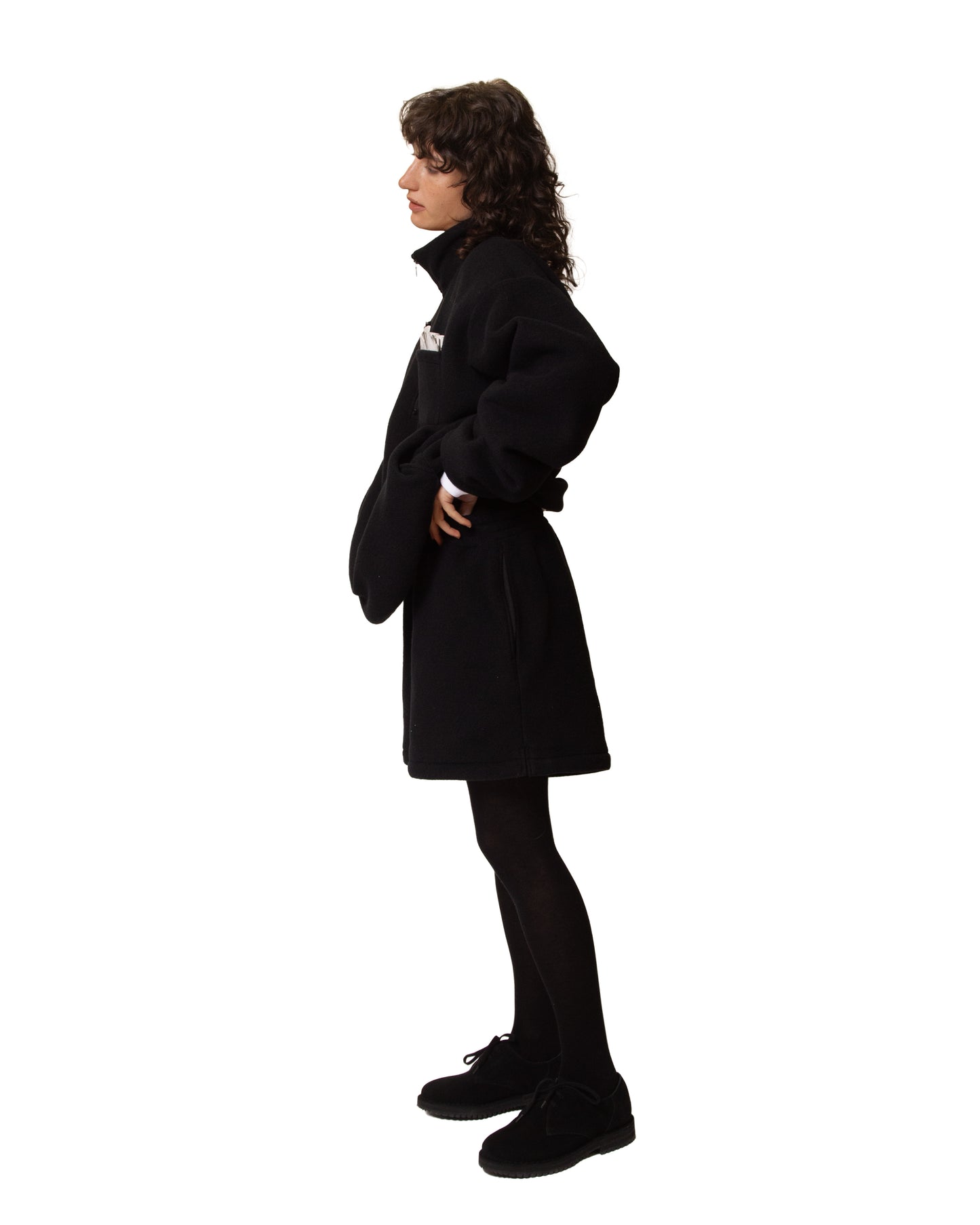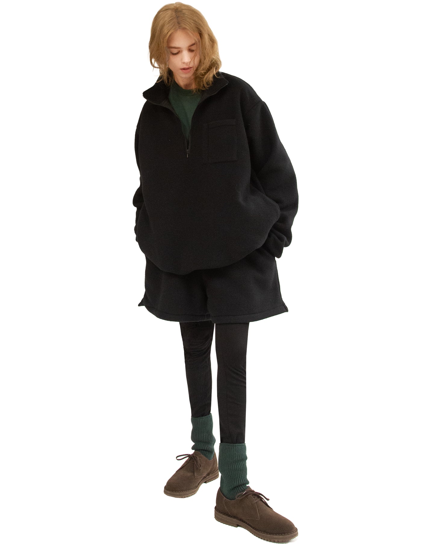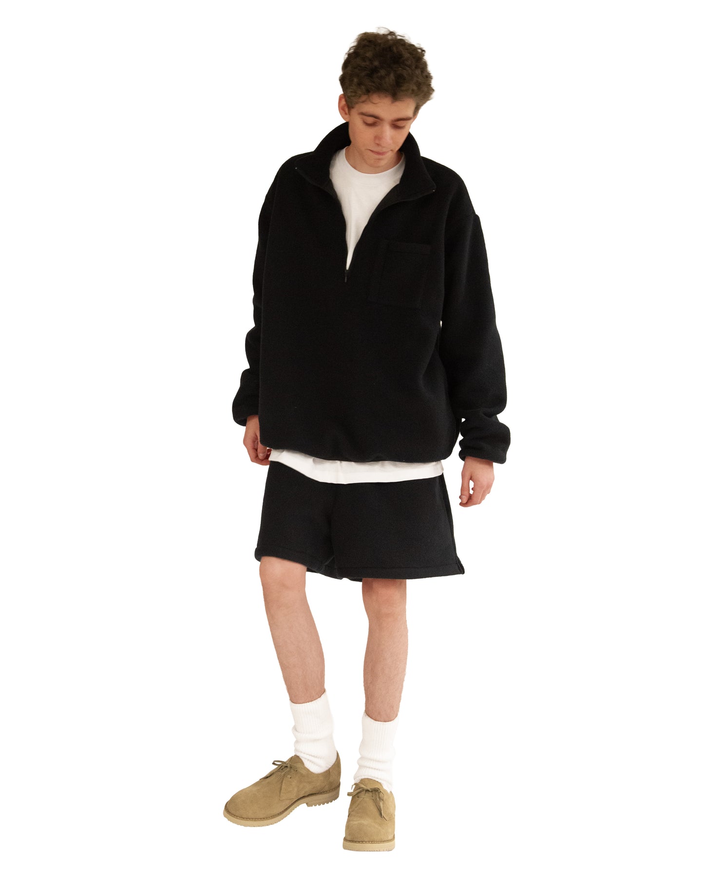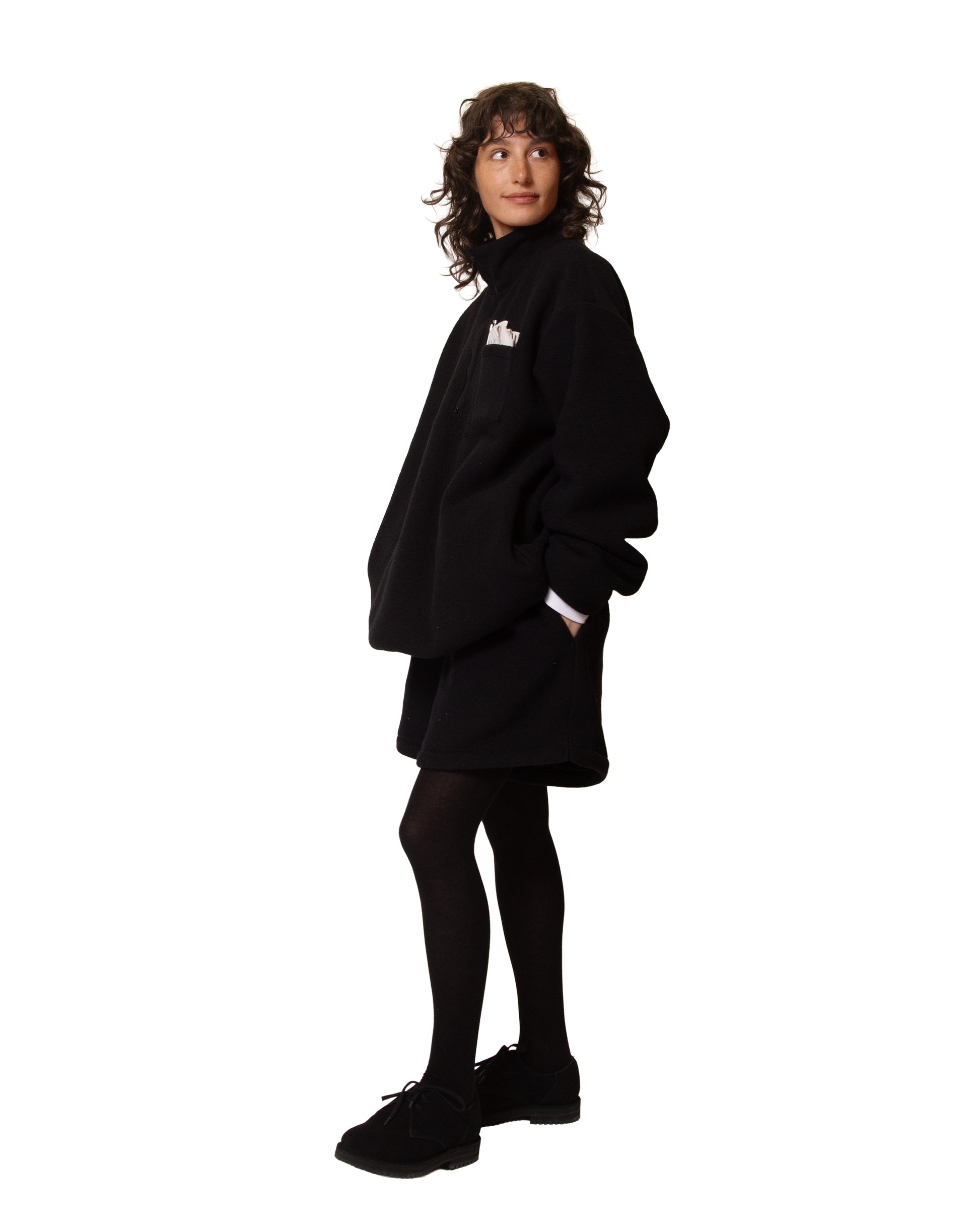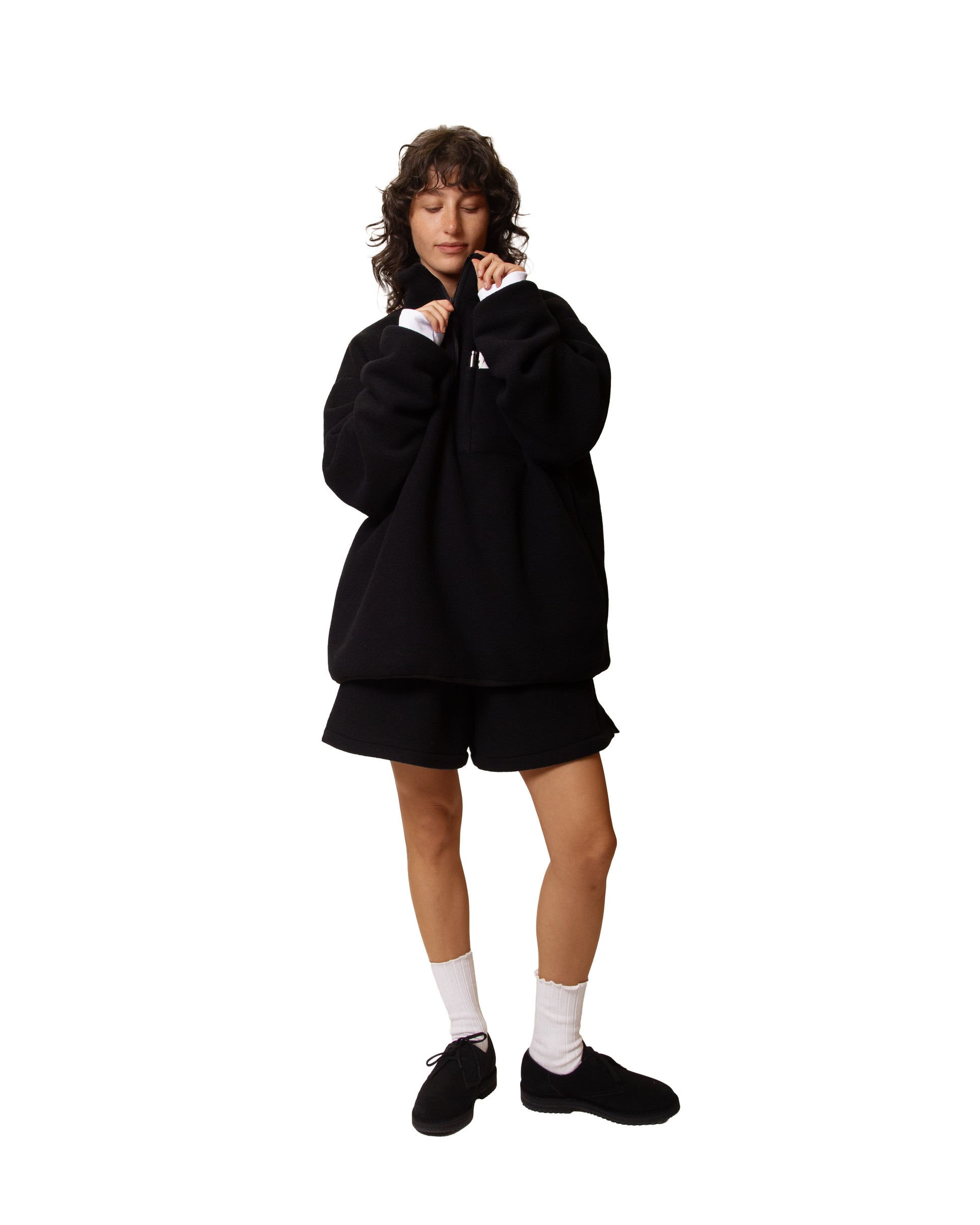 We were really into the trapezoid-shaped shorts made of eVent material, so we also produced them in fleece. Pair the oversized Half-Zip Top with these Fleece Shorts, and you are instantly comfy.